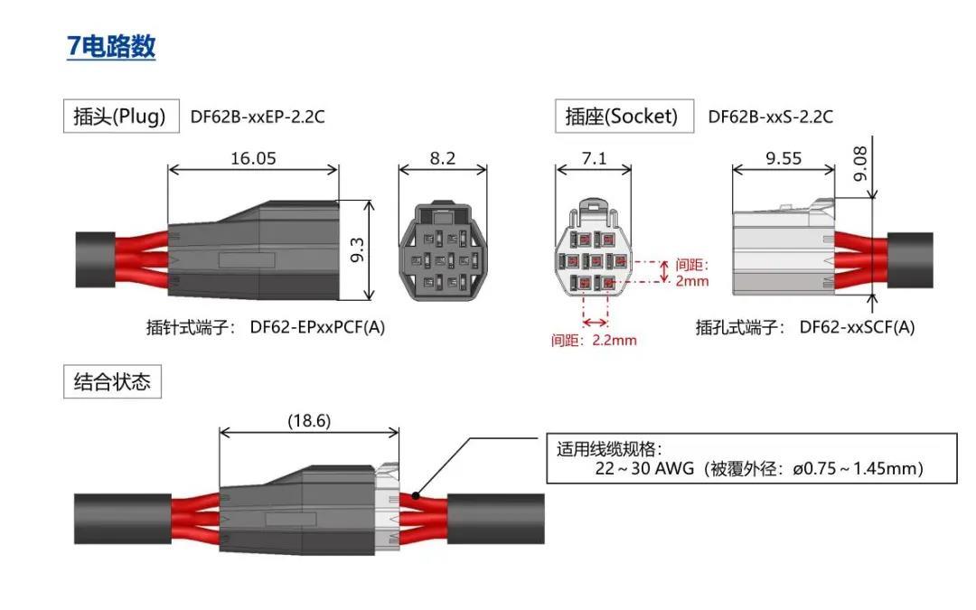 特點(diǎn) [SignalBee?] 2 x 2.2 mm間距 用于狹小空間纖細(xì)型中繼連接器(UL C-UL認(rèn)證產(chǎn)品) 1. 纖細(xì)光滑的外形適合狹窄空間的布線 2. 清晰的鎖扣感和目視可確認(rèn)是否鎖定 3. 可靠的接觸結(jié)構(gòu) 4. 堅(jiān)固的端子結(jié)構(gòu) 5. 芯數(shù)選型:2、3、4、5、6、7、13、24 DF62B:標(biāo)準(zhǔn)型 DF62C:鎖加部保護(hù)強(qiáng)化型 DF62P:面板安裝型 6. 可與DF11/DF59系列共用自動(dòng)壓著設(shè)備 7. 防冷凝措施(防水型DF62W) 細(xì)小